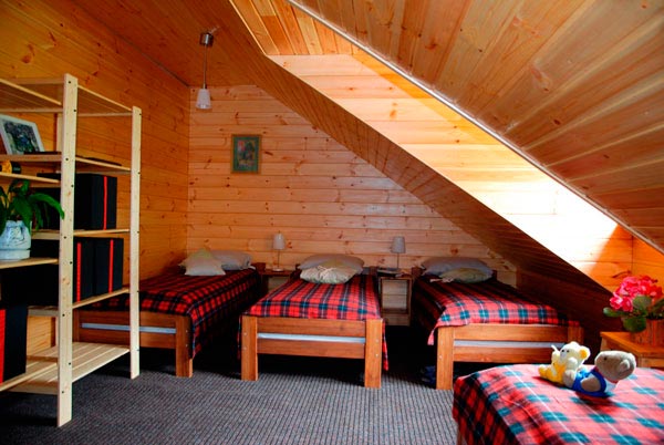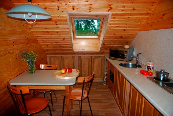 На мансарде — малая гостиная с телевизором и мягкой мебелью. Есть небольшая кухня для общего пользования с СВЧ печью.